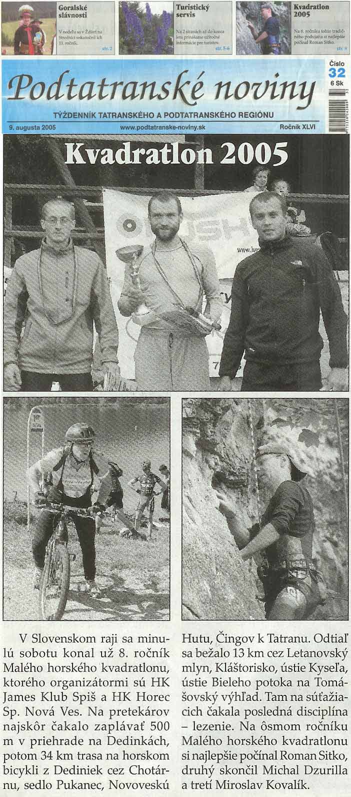 VIII. ročník unikátneho preteku - "Malý horský kvadratlon" - zloženého zo štyroch disciplín, ktorý je určený hlavne pre horolezcov, skialpinistov, horských bežcov a cyklistov sa uskutočnil 6.8.2005. Štartovalo sa o 1020 na Palcmanskej maši (hotel Priehrada) a cieľom bol Tomašovský výhľad. Vyhodnotenie a odovzdávanie cien prebehlo na chatke TJ Tatran na Čingove.