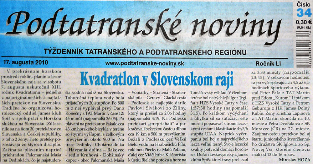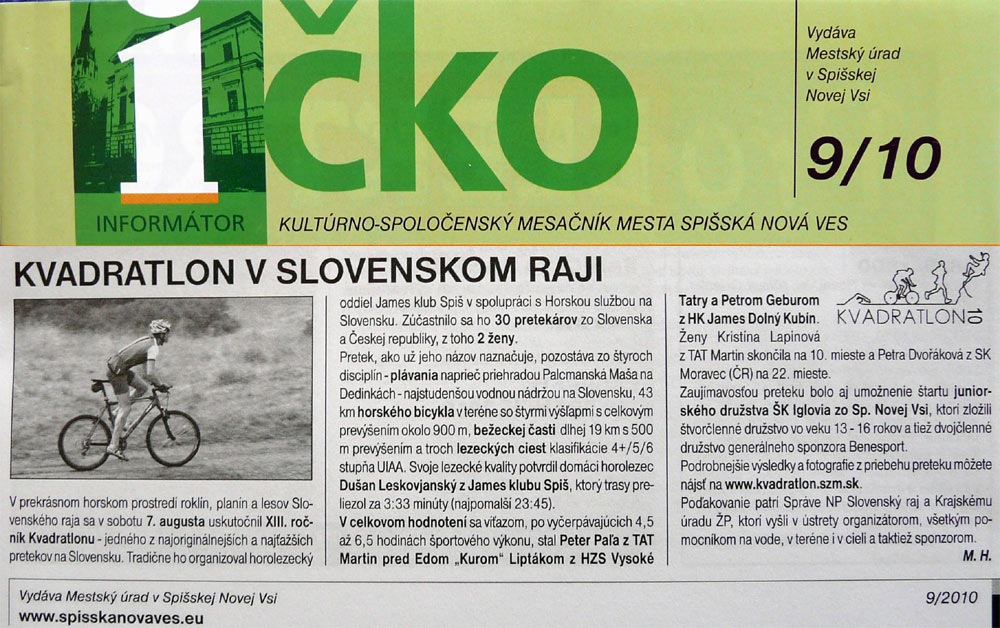 Je za nami XIII. ročník unikátneho preteku - "Malý horský kvadratlon" - zloženého zo štyroch disciplín, ktorý je určený hlavne pre horolezcov, skialpinistov, horských bežcov a cyklistov. Štartovali sme 7.8.2010. o 1015 na Palcmanskej maši a stretli sme sa v cieli na Tomašovskom výhľade. Vyhodnotenie, odovzdávanie cien a občerstvenie bolo na Čingove.