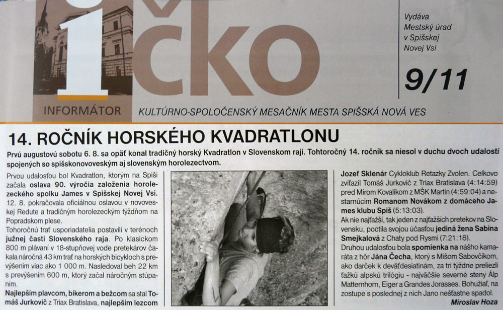Ďalší, už XIV. ročník unikátneho preteku - "Malý horský kvadratlon" - zloženého zo štyroch disciplín, ktorý je určený hlavne pre horolezcov, skialpinistov, horských bežcov a cyklistov sa uskutočnil 6.8.2011. Štartovali sme o 1020 na Palcmanskej maši plávaním, pokračovali krásnym bicyklovaním cez Hanesovú, popod Havraniu skalu, cez Stratenskú pílu a Geravy na Biele vody a za lezením sme sa prebehli cez Klauzy a Kláštorisko na Tomašovský výhľad. Vyhodnotenie, odovzdávanie cien a občerstvenie bolo na Čingove.